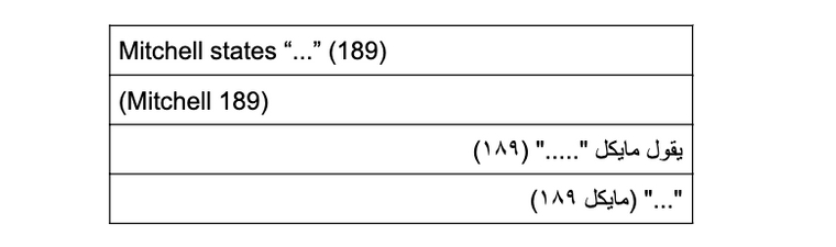 - أن يتضمّن الكلمة الأولى في المصدر الأصلي، والتي تكون عادة اسم الكاتب. بالإضافة إلى رقم الصفحة أو الصفحات التي تمّ الاقتباس منها.