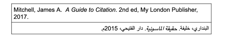 في حال كان هنالك أكثر من كاتب أو مؤلف يحملون جميعًا نفس اللقب، قم بكتابة الحرف الأول لاسم الكاتب متبوعًا باللقب (اسم العائلة) كما هو موضّح في المثال أدناه: