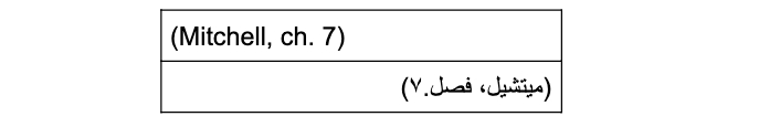 - في حال لم يتوفّر أي أرقام للفصول أو الفقرات، يُكتب اسم المؤلف فقط بين قوسين.