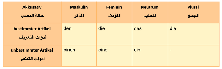 ملاحظة مهمّة أخرى وهي أنّه عند النصب في اللغة الألمانية، فإنّ التغيير يطرأ على المذكّر فقط، كما هو موضّح في الجدول التالي: