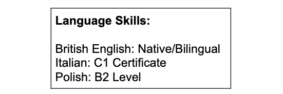 - احرص على ذكر مهاراتك اللغوية وتحديد مستواك فيها مستخدمًا إطارًا معياريًا واحدًا فقط (سنتحدّث عن هذا لاحقًا في المقال).