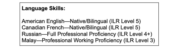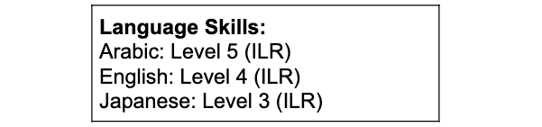 كما ترى في هذا المثال، فقد تمّ ذكر اللغات الثلاث مع توضيح مستوى الكفاءة في كلّ منها. وتمّ كتابة (ILR) بين قوسين لتوضيح الإطار المعياري الذي تمّ استخدامه.